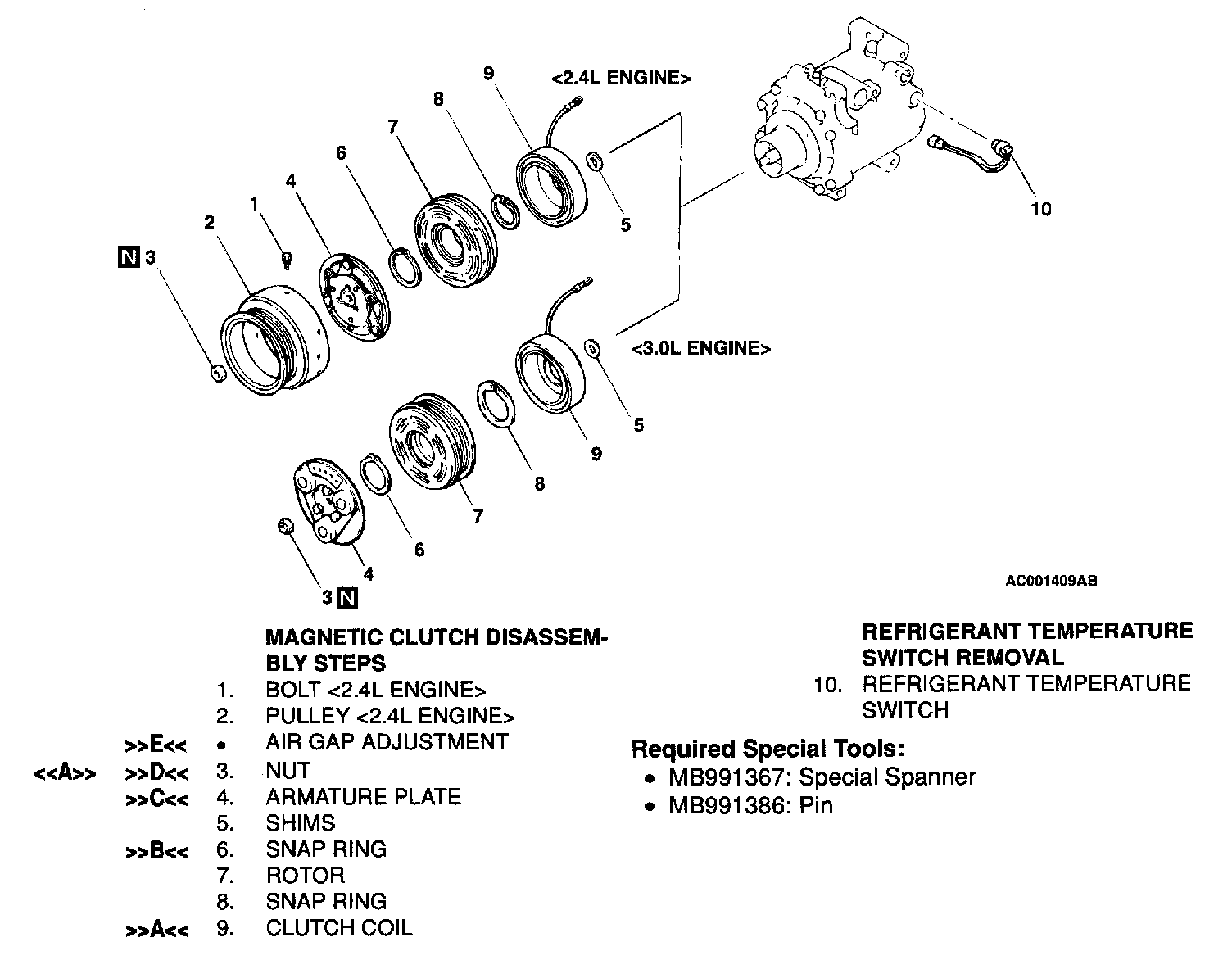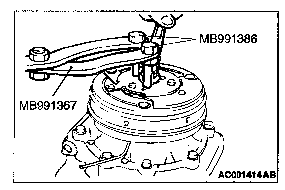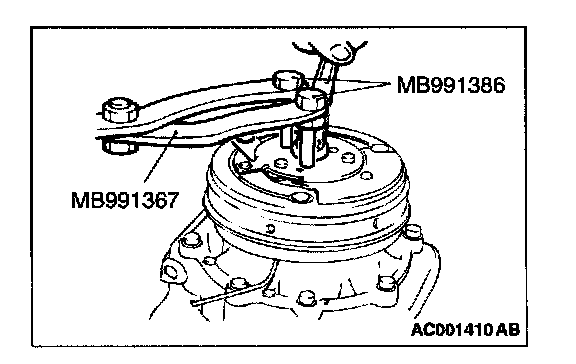 Use special tools MB991367 and MB991386 to hold the magnetic clutch, and remove the nut.