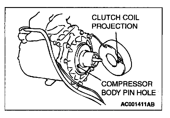 When installing the clutch coil to the A/C compressor body, install so that the pin hole of the A/C compressor body and the clutch coil projection are aligned.
