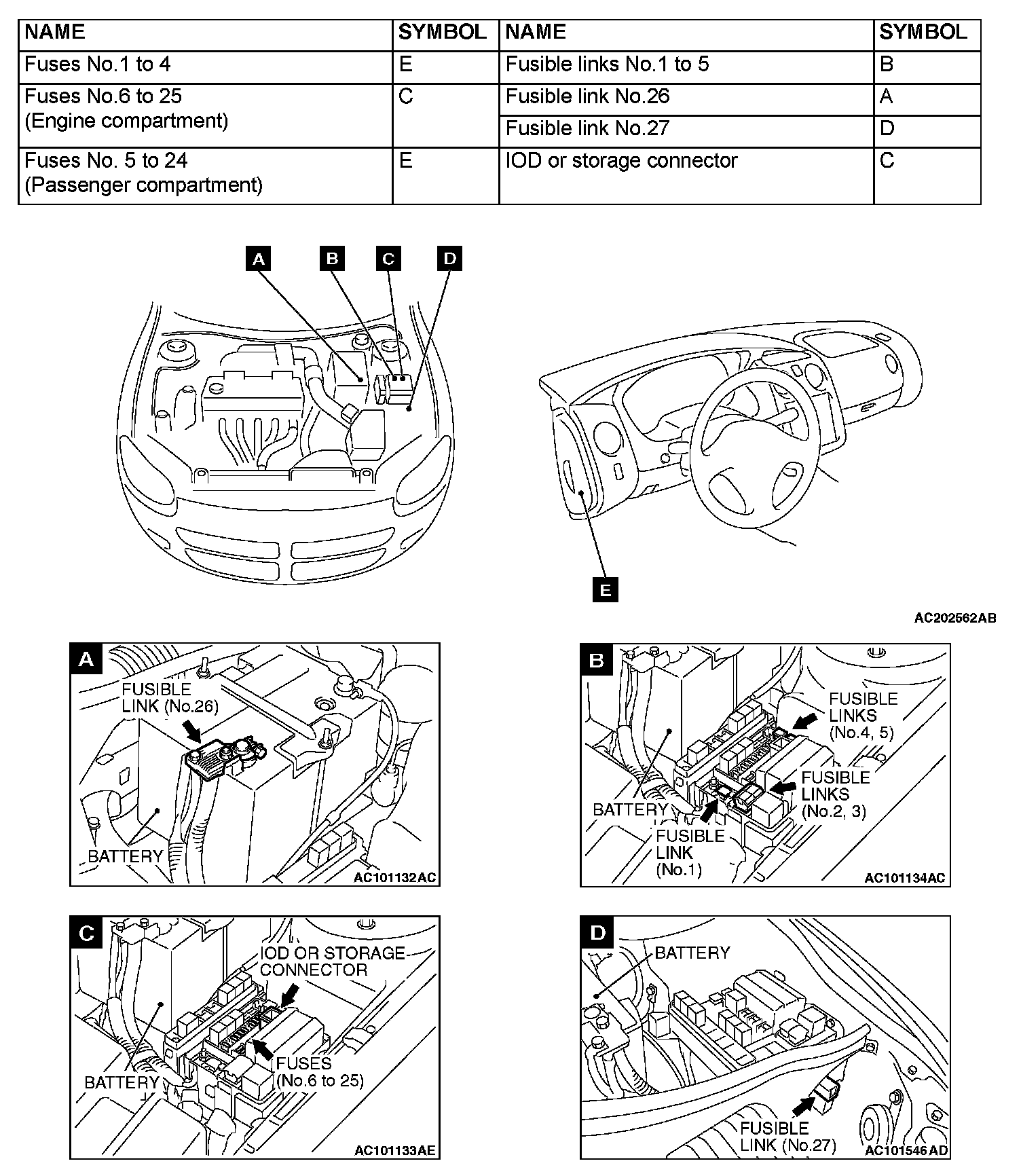 Fusible Link, Fuse And IOD Or Storage Connector Location Index, Overall View And Views A - D: