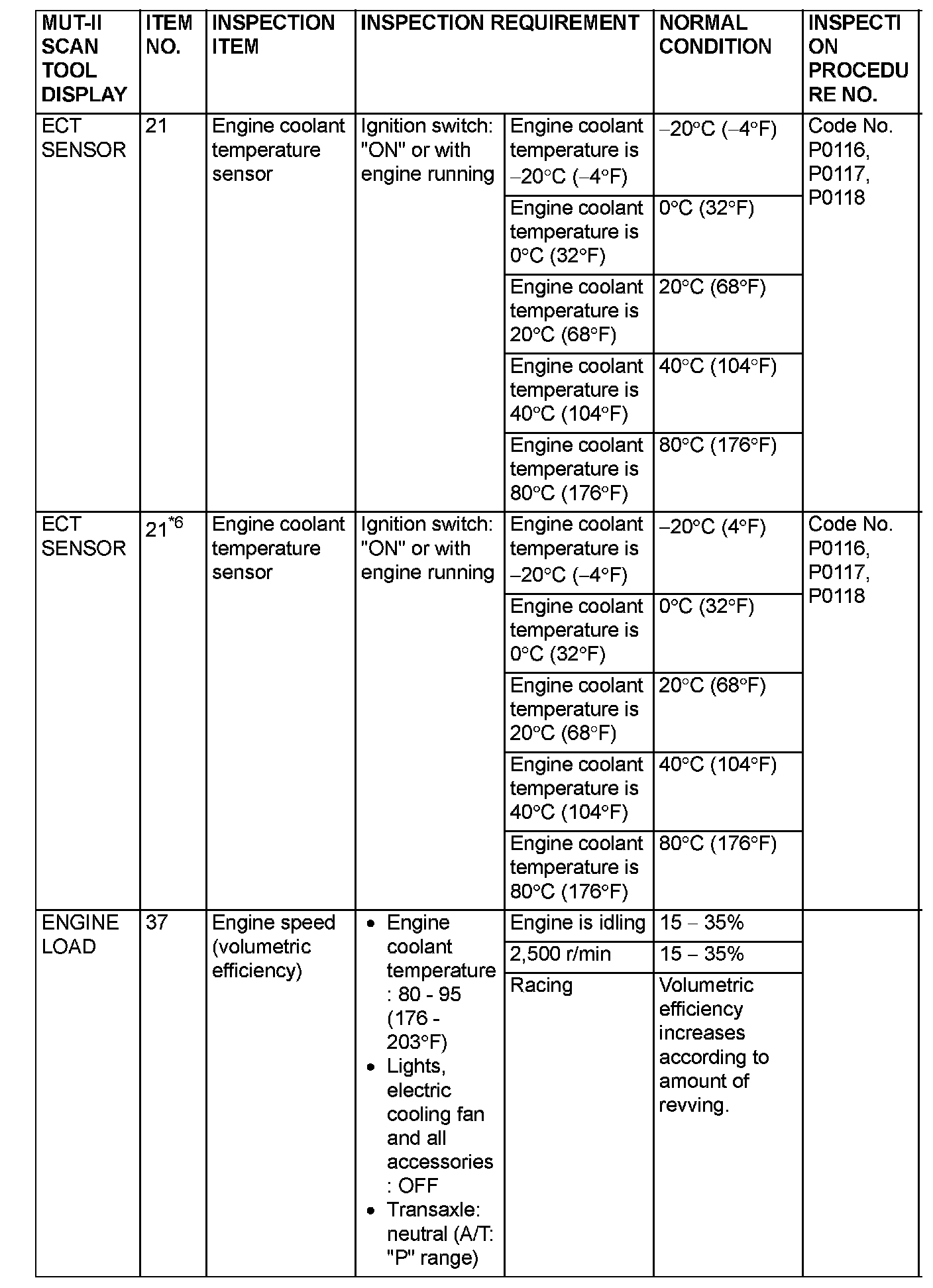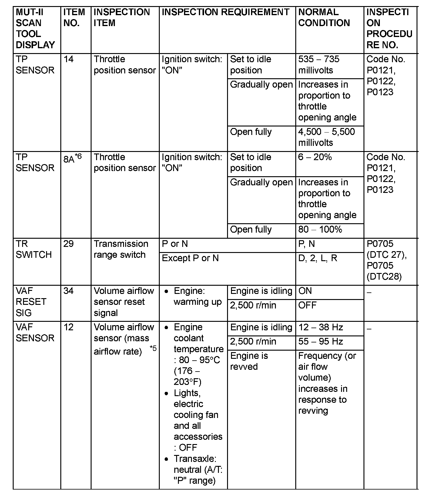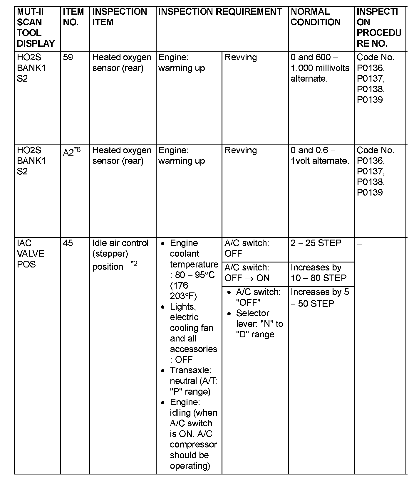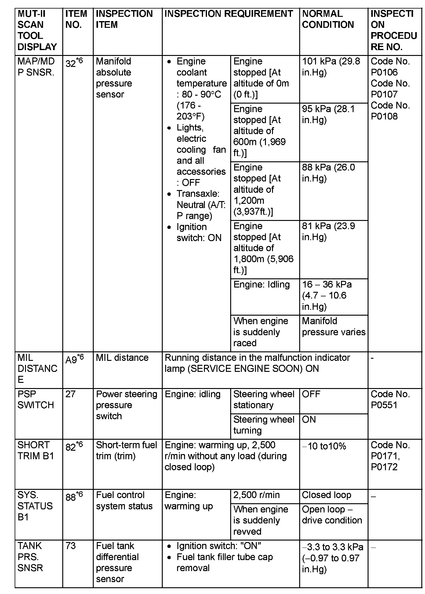 - *6: GST items. [Data list items consist of MUT-II items and GST items. GST items can be accessed through the use of a general scan tool (GST). When scan tool MB991502 (MUT-II) is used, MUT-II items appear alphabetically; then, GST items appear alphabetically. The black and white characters of the GST items are inverted from the MUT-II items.]