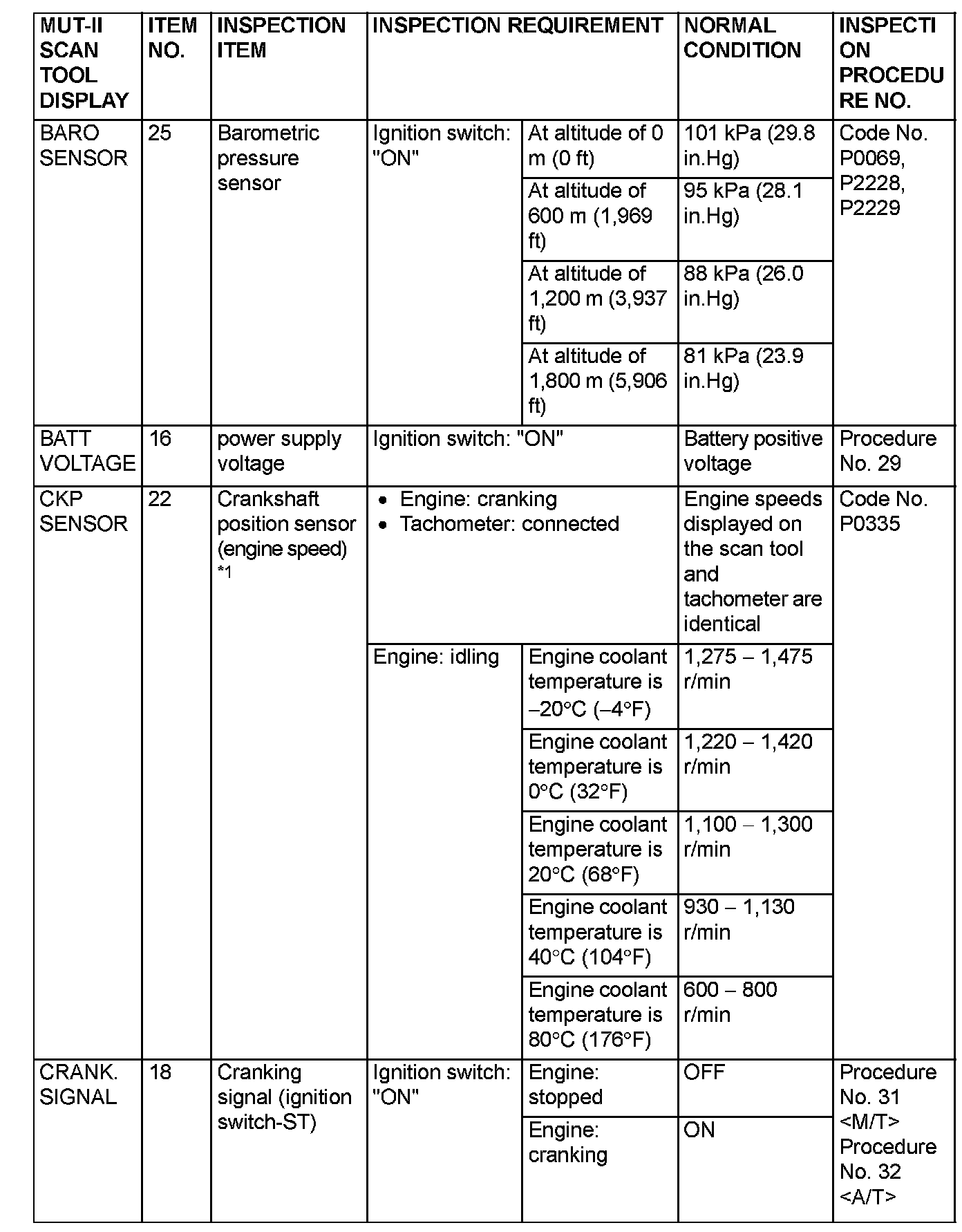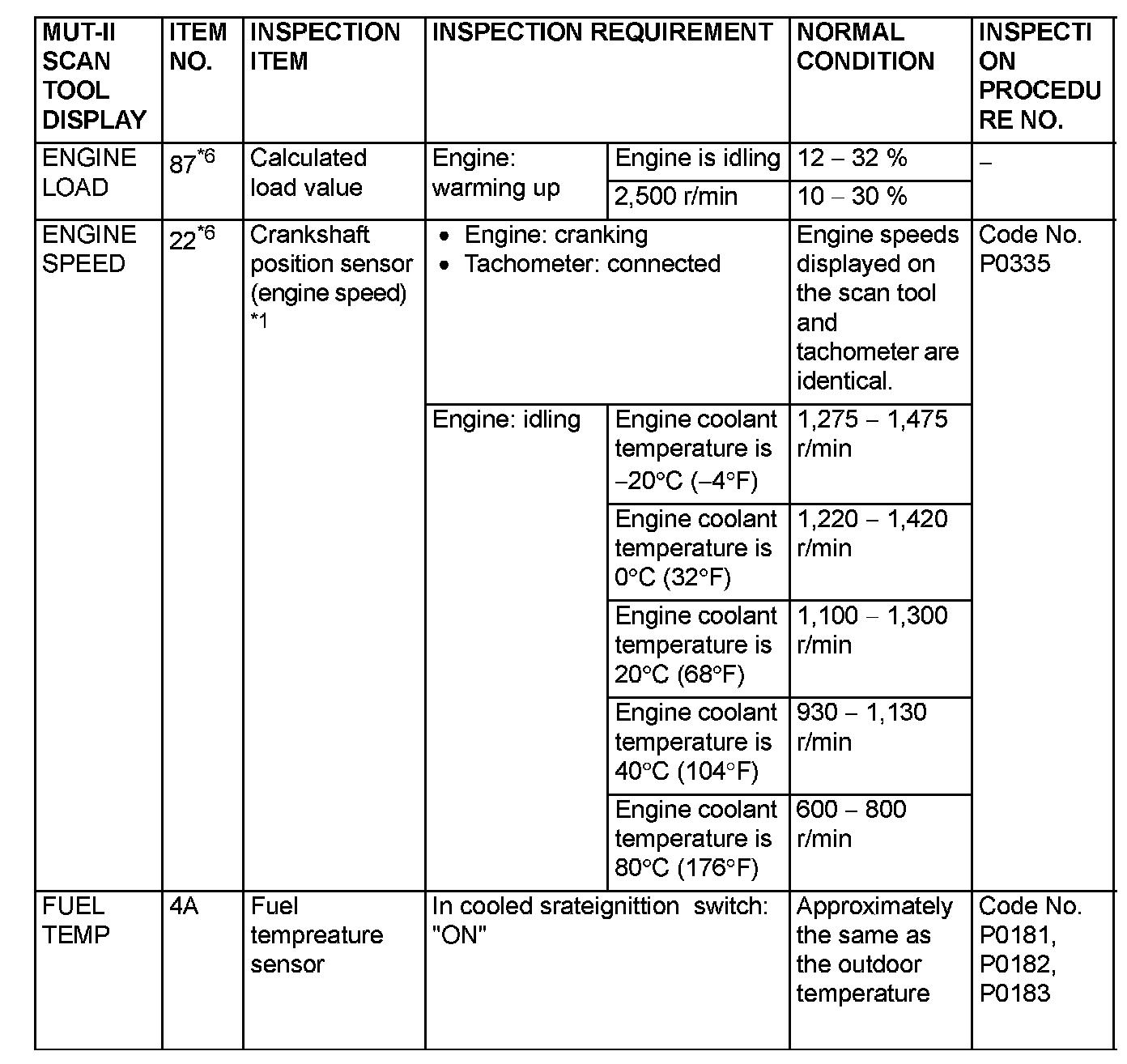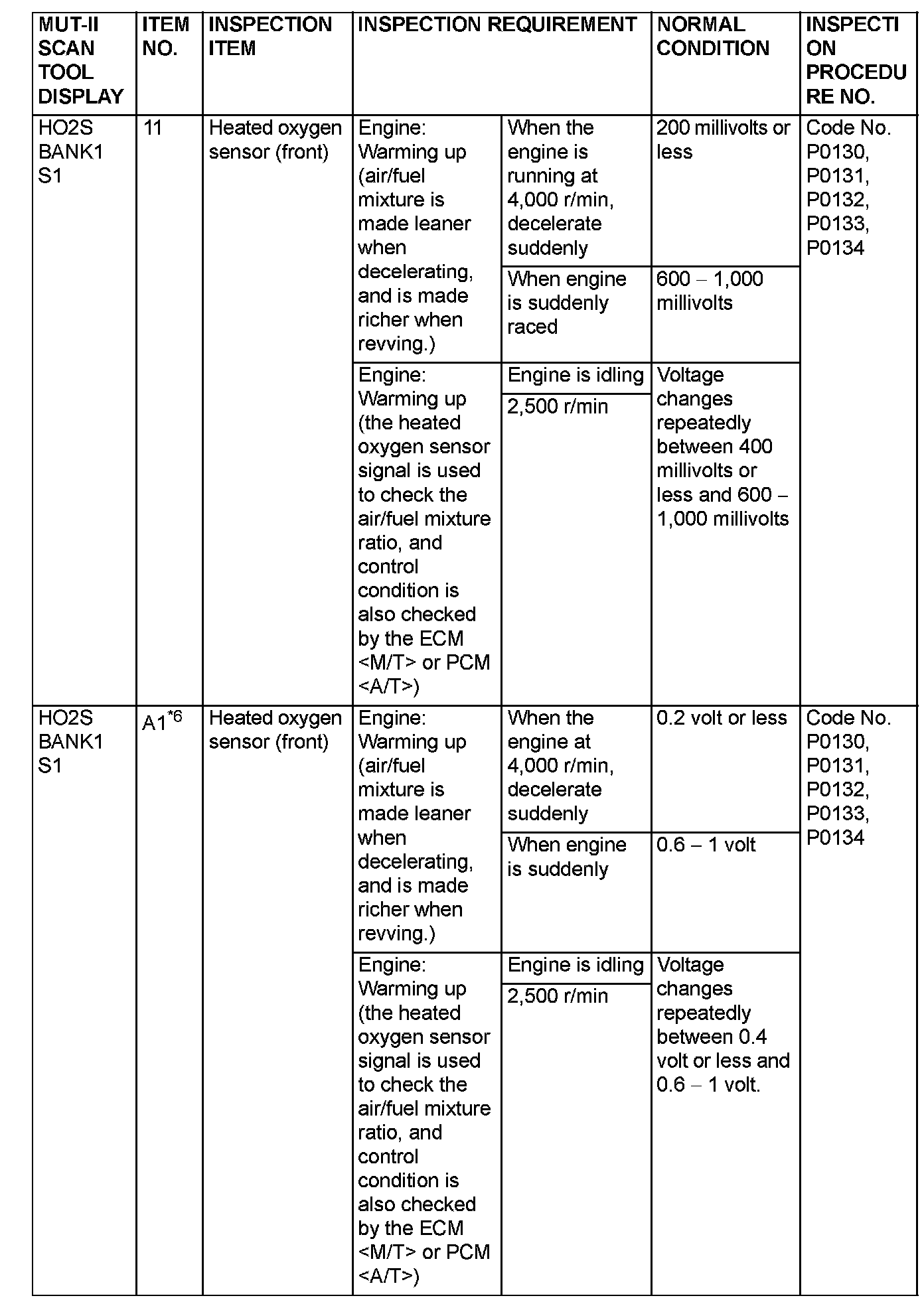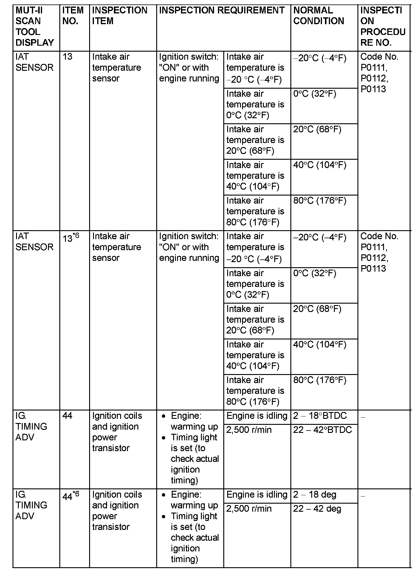- *6: GST items. [Data list items consist of MUT-II items and GST items. GST items can be accessed through the use of a general scan tool (GST). When scan tool MB991502 (MUT-II) is used, MUT-II items appear alphabetically; then, GST items appear alphabetically. The black and white characters of the GST items are inverted from the MUT-II items.]