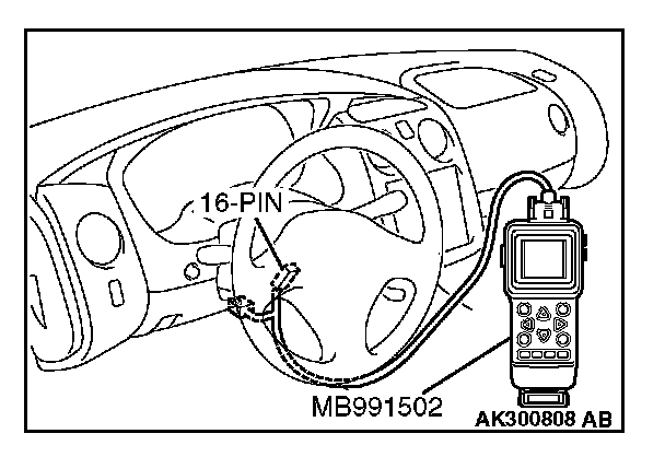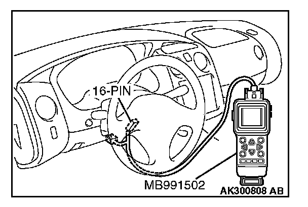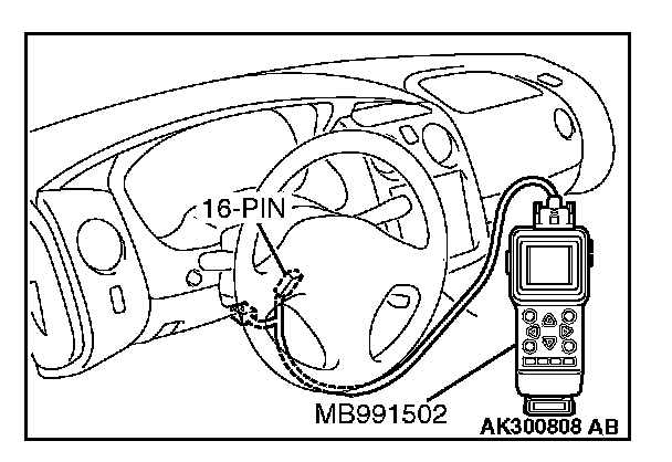CAUTION: To prevent damage to scan tool MB991502, always turn the ignition switch to the "LOCK" (OFF) position before connecting or disconnecting scan tool MB991502.