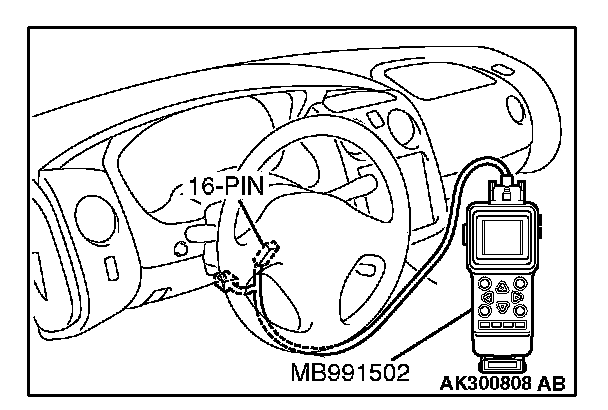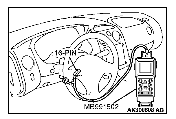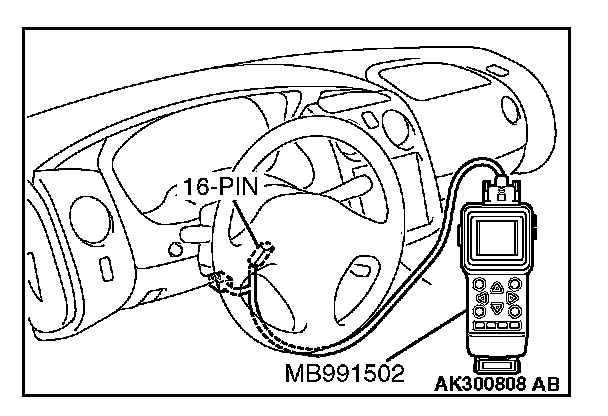 CAUTION: To prevent damage to scan tool MB991502, always turn the ignition switch to the "LOCK" (OFF) position before connecting or disconnecting scan tool MB991502.