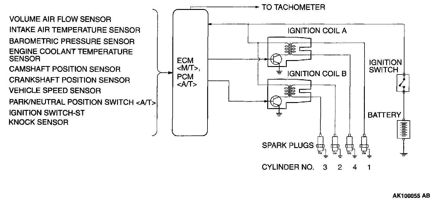 This system is provided with two ignition coils (A and B) with built-in ignition power transistors for the number I and number 4 cylinders, and number 2 and number 3 cylinders respectively.