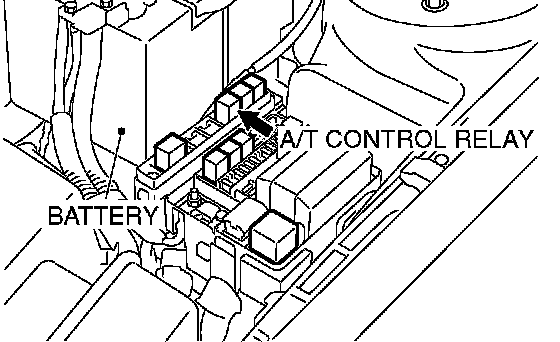 2. Use jumper wires to connect A/T control relay terminal 3 to the negative battery terminal and terminal 2 to the positive battery terminal.