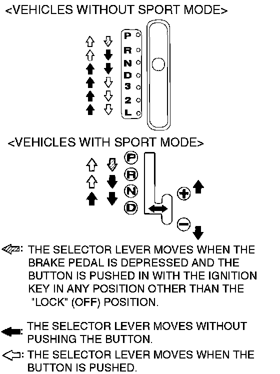 NOTE: The A/T mix-operation prevention mechanism prevents movement of the selector lever from the "P" position if the ignition switch is in a position other than "LOCK" (OFF) and the brake pedal is not depressed.