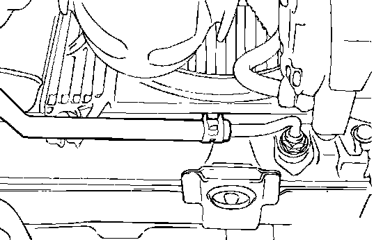 1. Disconnect the hose shown in the illustration which connects the transaxle and the oil cooler (inside the radiator). Place a container under the hose to collect the discharge.