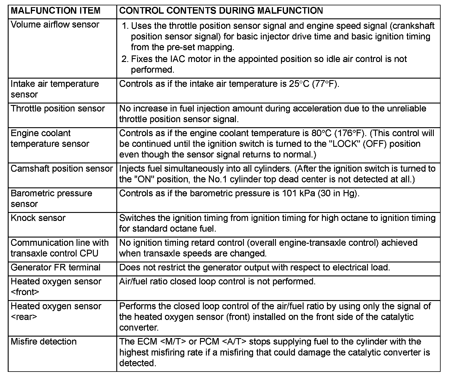 When the main sensor malfunctions are detected by the diagnostic test mode, the vehicle is controlled by means of the following defaults.