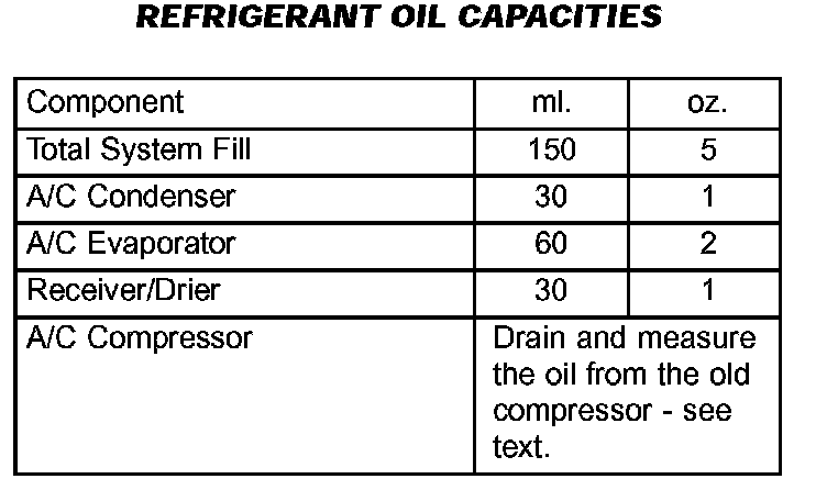 Refrigerant oil must be added when a receiver/drier, A/C evaporator or A/C condenser is replaced. See the Refrigerant Oil Capacities chart. When an A/C compressor is replaced, the refrigerant oil must be drained from the old compressor and measured. Drain all of the refrigerant oil from the new A/C compressor, then fill the new compressor with the same amount of refrigerant oil that was drained out of the old compressor.
