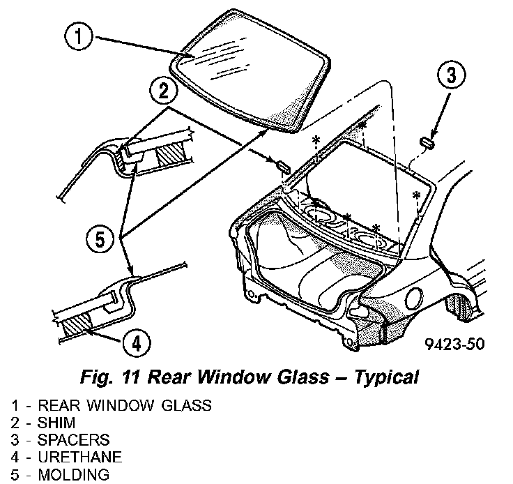 5. Install the glass in the same manner described in the Windshield section of this group (Fig. 11).