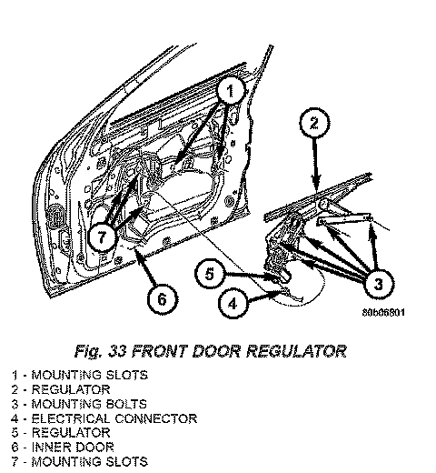 8. Slide regulator rearward and rotate forward end of roller channel through access hole in door panel.
