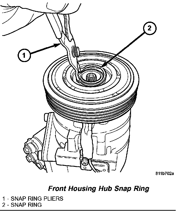 CAUTION: If the snap ring is not fully seated in the groove it will vibrate out, resulting in a clutch failure and severe damage to the front housing of the compressor.