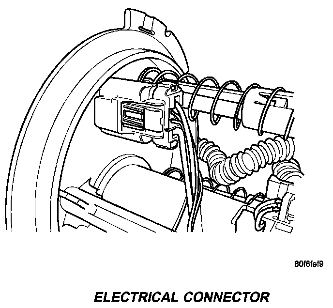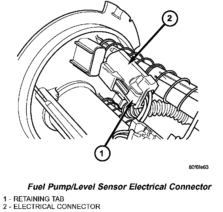 1. Depress retaining tab and remove the fuel pump/level sensor connector from the bottom of the fuel pump module electrical connector.
