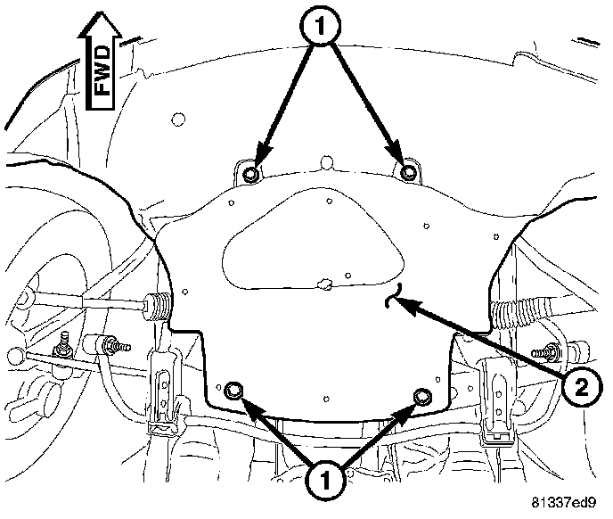 5. Remove lower splash shield retaining bolts (1) and splash shield (2).