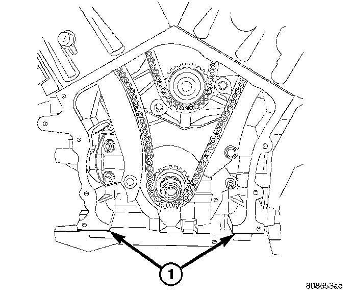 2. Before installing timing cover gasket apply a 1/8 inch bead of Mopar Engine RTV GEN II to the parting lines between the oil pan and cylinder block (1)