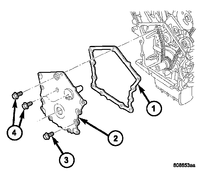 3. Install timing cover (2) and gasket (1). Tighten M10 cover bolts (4) to 54 Nm (40 ft. lbs.) and M6 bolts (3) to 12 Nm (105 inch lbs.).