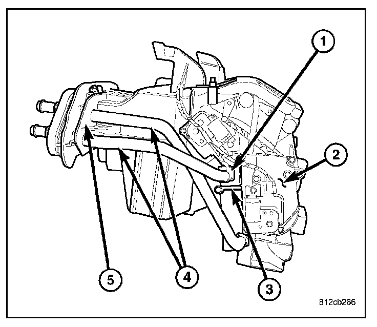 The heater core (1) is mounted into the driver side of HVAC air distribution housing (2), located behind the instrument panel. The heater core is a heat exchanger made of rows of tubes and fins and is secured to the air distribution housing by a plastic retaining bracket (3). The heater core tubes (4) are attached to the side of the heater core and are secured to the HVAC housing by a removable flange (5).