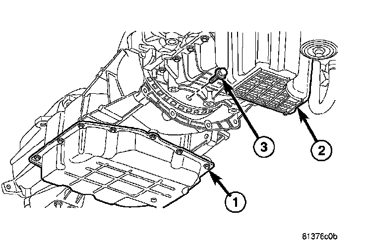 27. Remove the bolts (1) holding the engine oil pan (2) to the transmission (3).