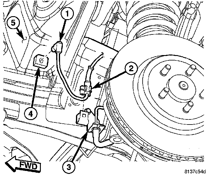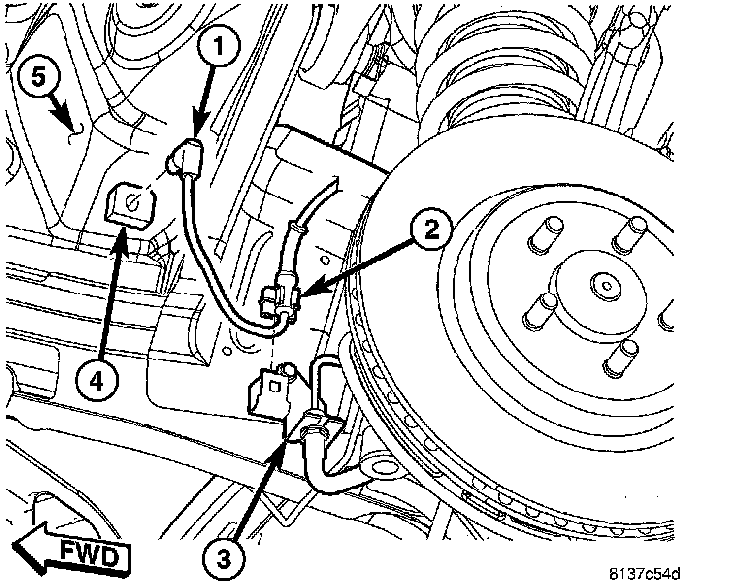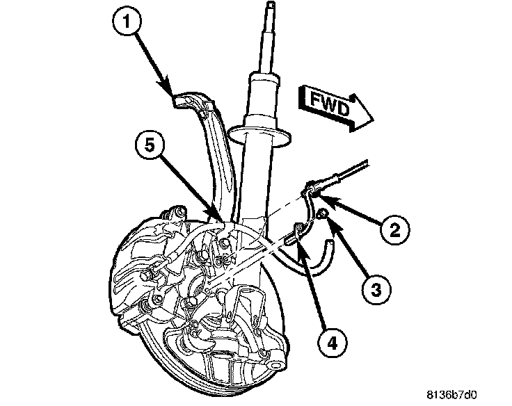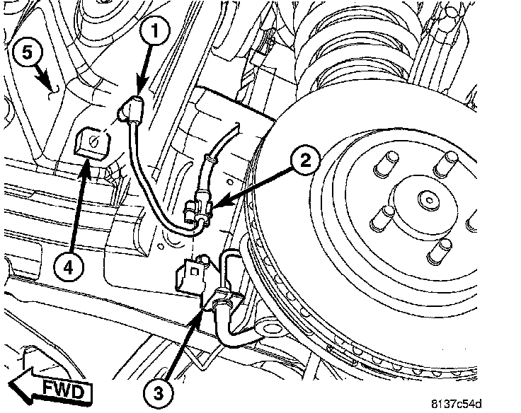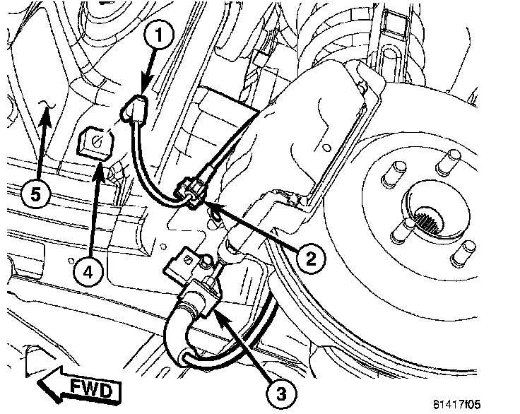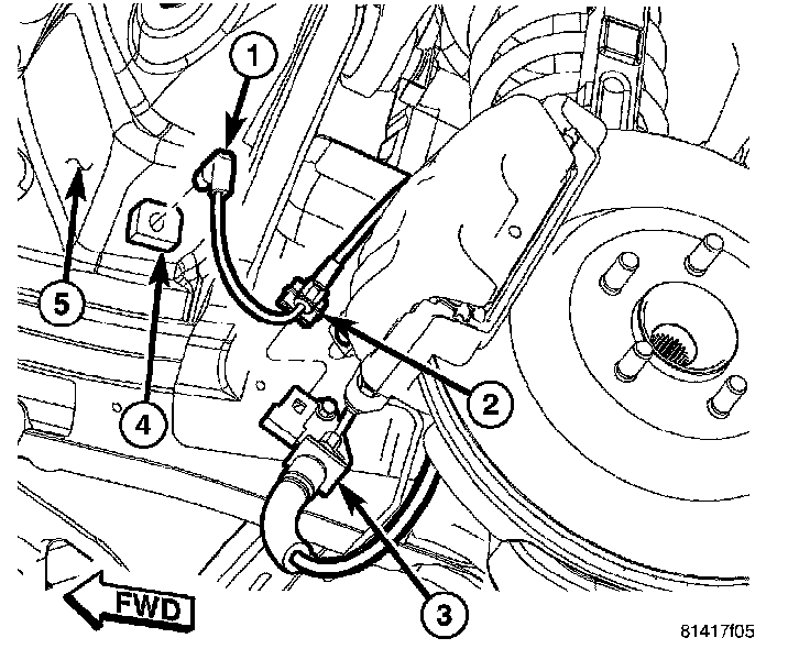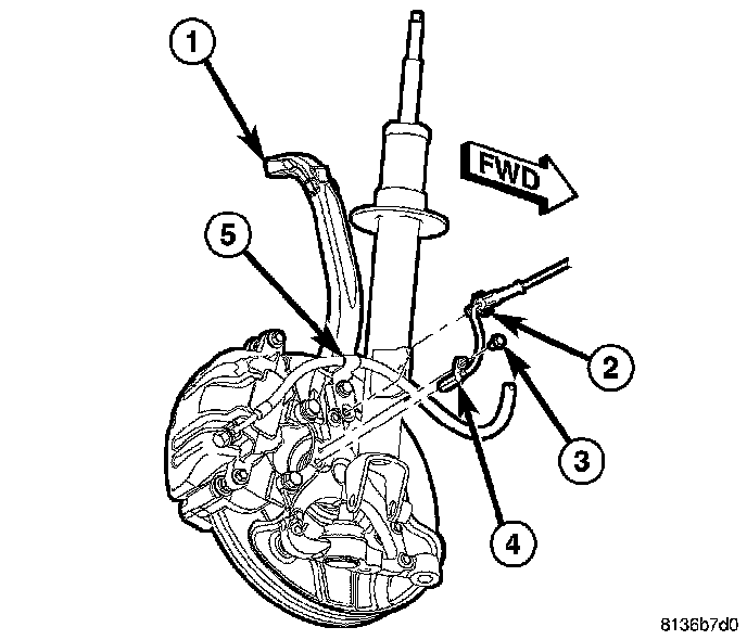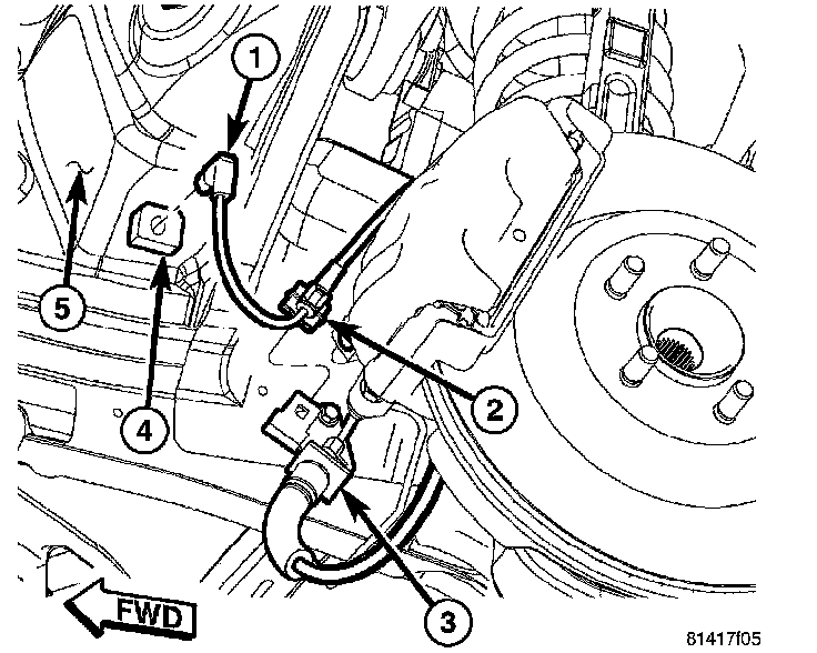 2. Attach wheel speed sensor cable and routing clip (2) to brake hose routing bracket (5).