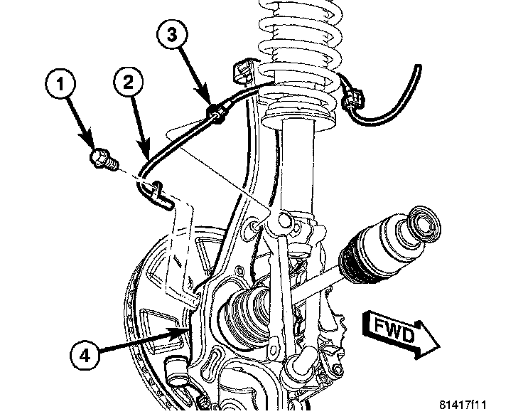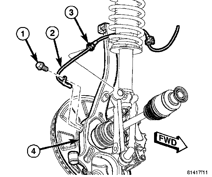 1. Install wheel speed sensor (2) head into knuckle (4) and install mounting screw (1). Tighten screw to 11 Nm (95 inch lbs.) torque.