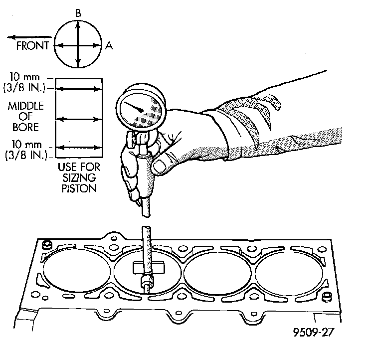 Measure the cylinder bore at three levels in directions A and B. Top measurement should be 10 mm (3/8 inch) down and bottom measurement should be 10 mm (3/8 inch) up from bottom of bore.