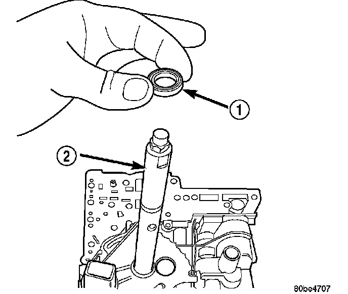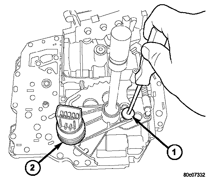 1. Install the TRS (2) to the manual shaft. Make sure TRS locating pin rests in manual valve bore slot.