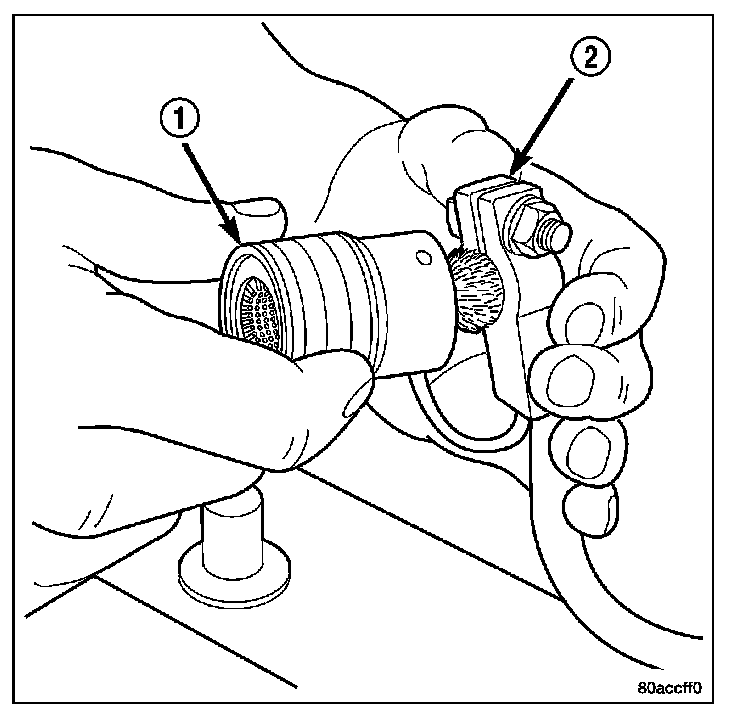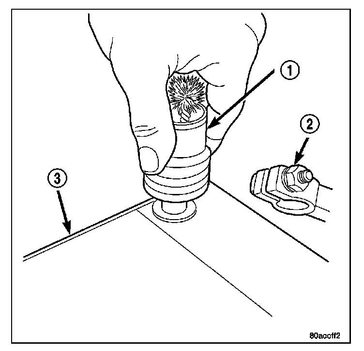 1. Clean the battery cable terminal clamps (2) of all corrosion. Remove any corrosion using a wire brush or cleaning tool (1), and a sodium bicarbonate (baking soda) and warm water cleaning solution.