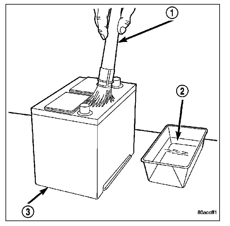 3. If the removed battery is to be reinstalled, clean the outside of the battery case and the top cover (3) with a sodium bicarbonate (baking soda) and warm water cleaning solution (2) using a stiff bristle parts cleaning brush (1) to remove any acid film. Rinse the battery with clean water. Ensure that the cleaning solution does not enter the battery cells through the vent holes. If the battery is being replaced, confirm that the replacement battery is the correct size and has the correct ratings for the vehicle.