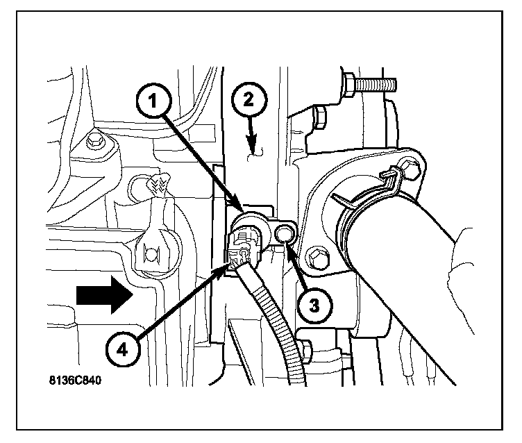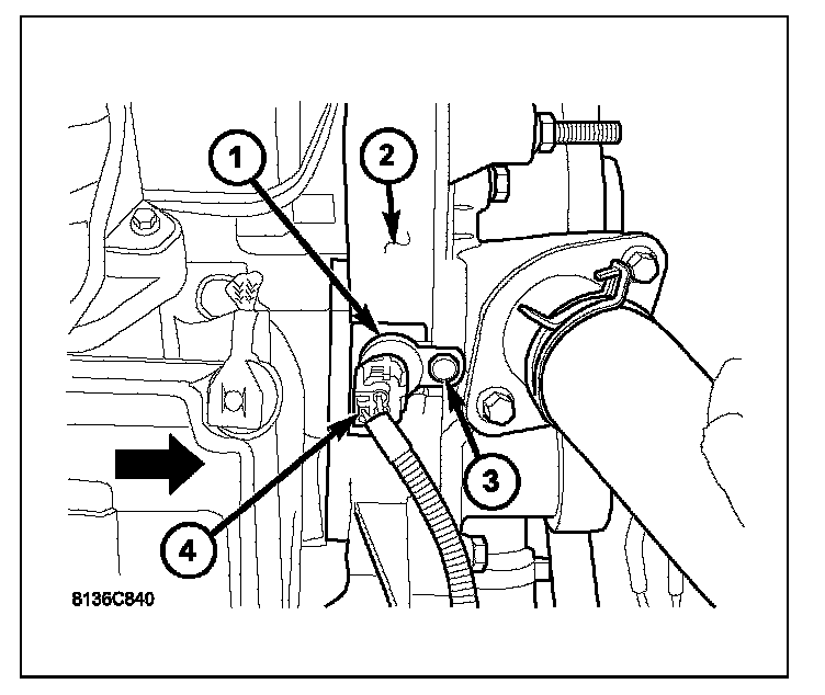 3. Install sensor (1) into timing chain cover (2) with a slight rocking action. Do not twist sensor into position as damage to O-ring may result.