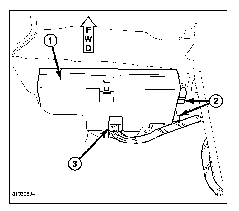 The heated seat module (1) is located under the right front seat. It has a single electrical connector (3) and four locking tabs (2) that secure it to the floor cross member. The module can be accessed through the separation between the front and rear carpet assemblies.