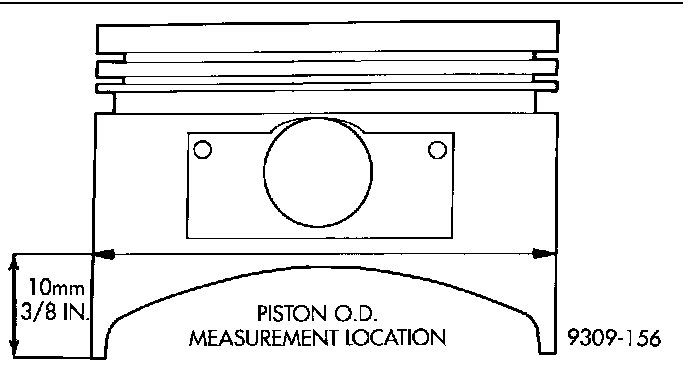 Piston and cylinder wall must be clean and dry Piston diameter should be measured 90 degrees to piston pin at size location shown. Cylinder bores should be measured halfway down the cylinder bore and transverse to the engine crankshaft center line. Refer to Engine Specifications. Pistons and cylinder bores should be measured at normal room temperature, 70°F (21°C).