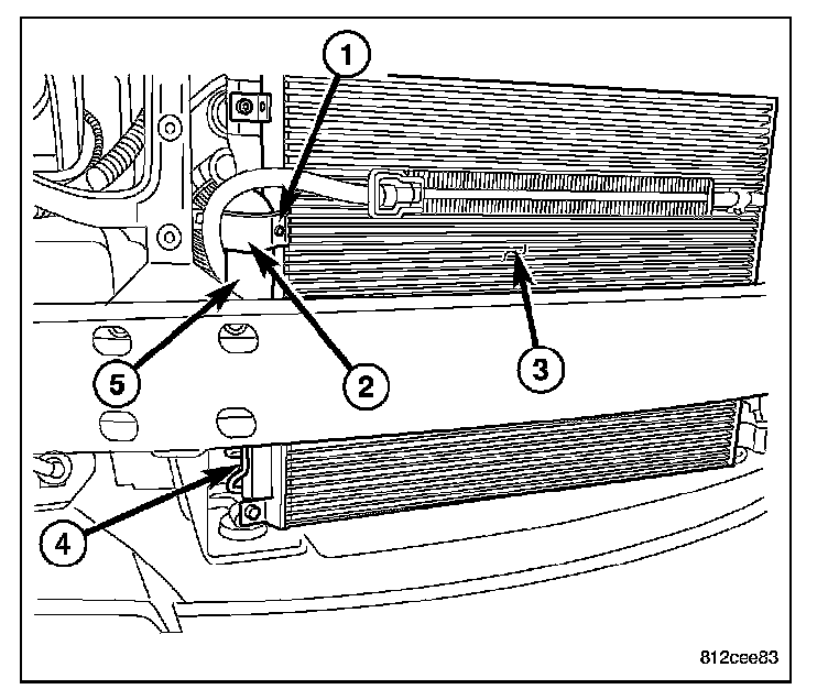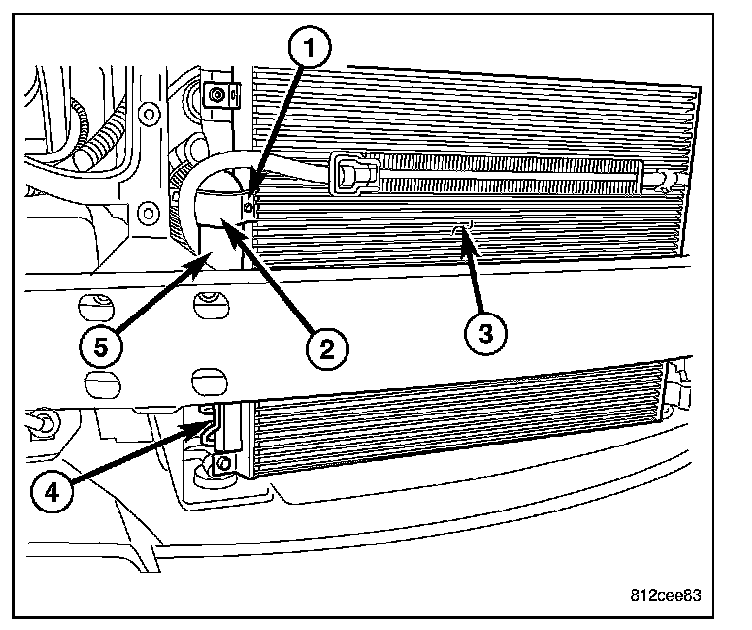 5. Remove the bolt (4) that secures the receiver/drier (5) to the A/C condenser.