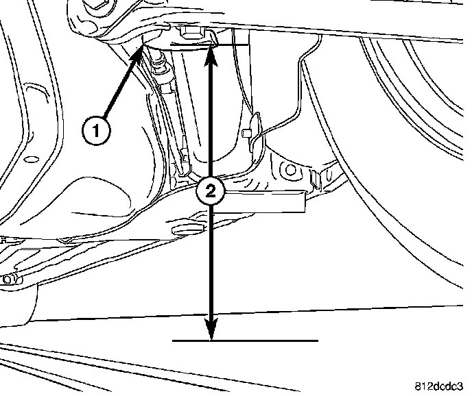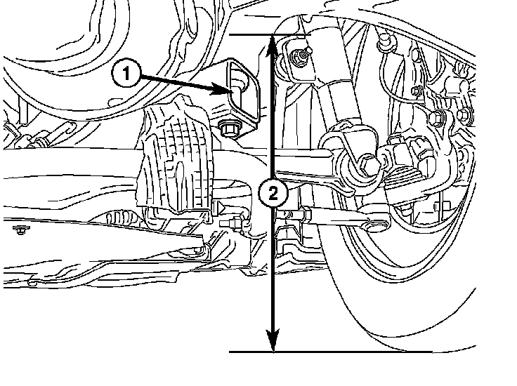 2. Rear - On each side of the vehicle, measure the distance (2) from the travel limiter (1) attached to the front rear crossmember mount bushing to the floor or alignment rack/lift runway surface. It may be necessary to measure to the bottom of a straight edge, placed from lift runway to runway, to get an accurate measurement.
