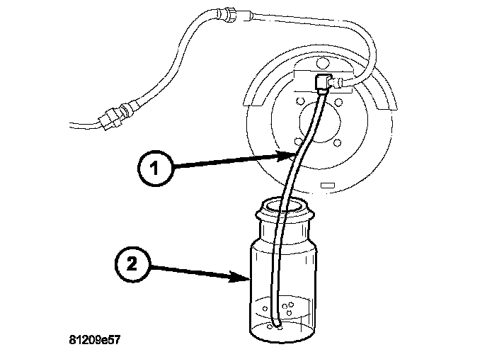 WARNING: When bleeding the brake system wear safety glasses. A clear bleed tube (1) must be attached to the bleeder screws and submerged in a clear container filled part way with clean brake fluid (2). Direct the flow of brake fluid away from yourself and the painted surfaces of the vehicle. Brake fluid at high pressure may come out of the bleeder screws when opened.