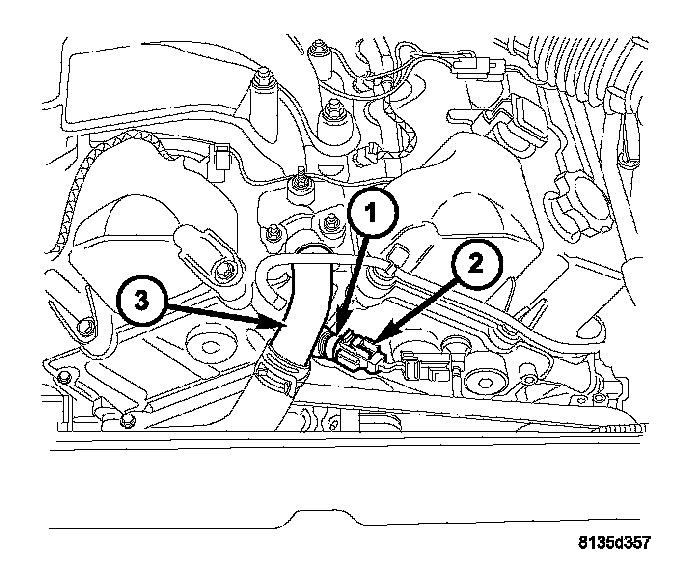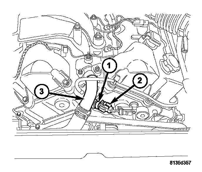 2. Install engine coolant temperature sensor (1) into coolant outlet tube (3).