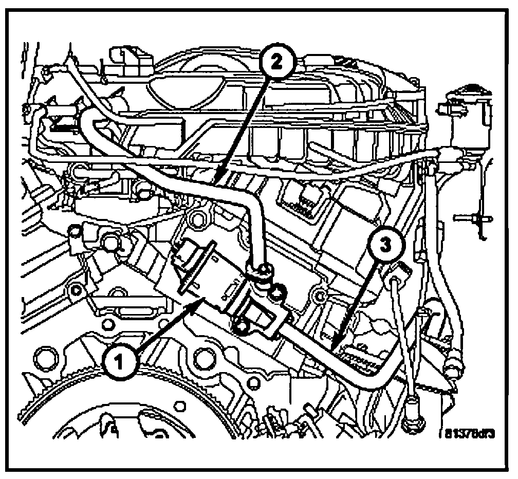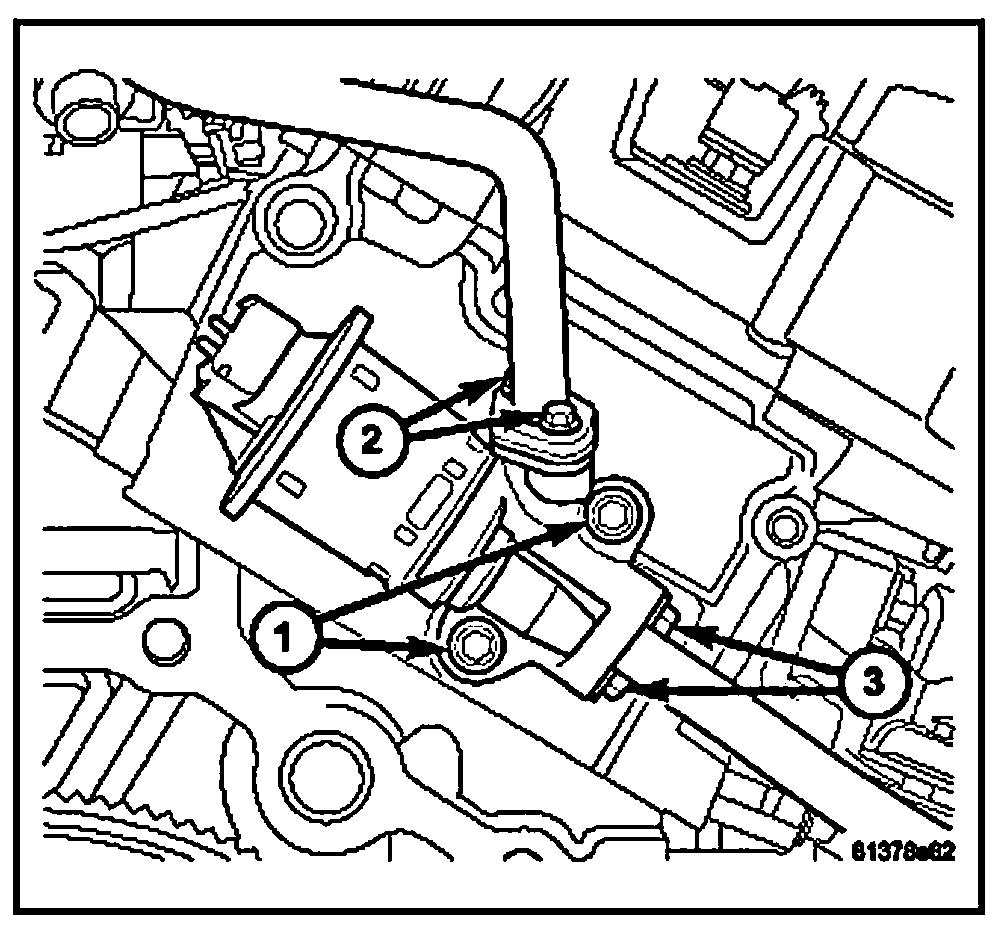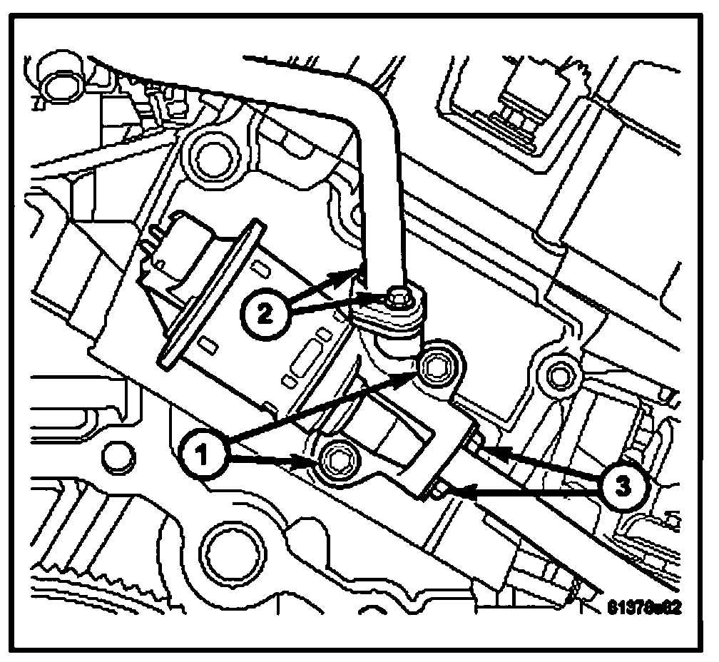 1. EGR system components and location. Upper tube (2), EGR valve (1), and Lower tube (3).