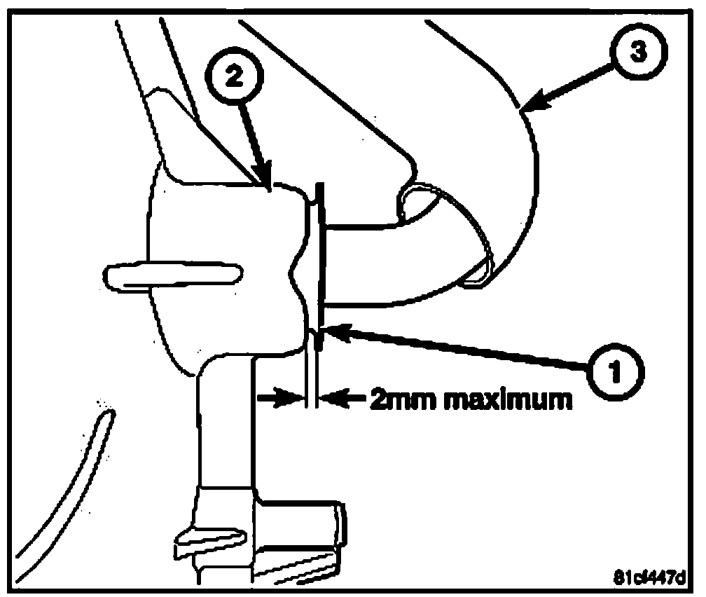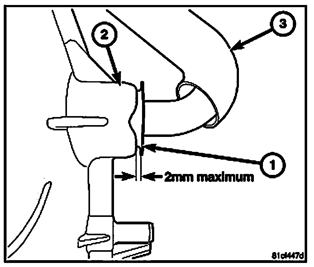 NOTE: The EGR tube flange (1) does not need to be flush with the intake manifold (2) to be sealed. The EGR tube flange can be up to 2 mm (0.08 in.) from intake manifold and still be sealed. This design allows the EGR tube position to vary with the tolerance stack up and remain properly sealed.