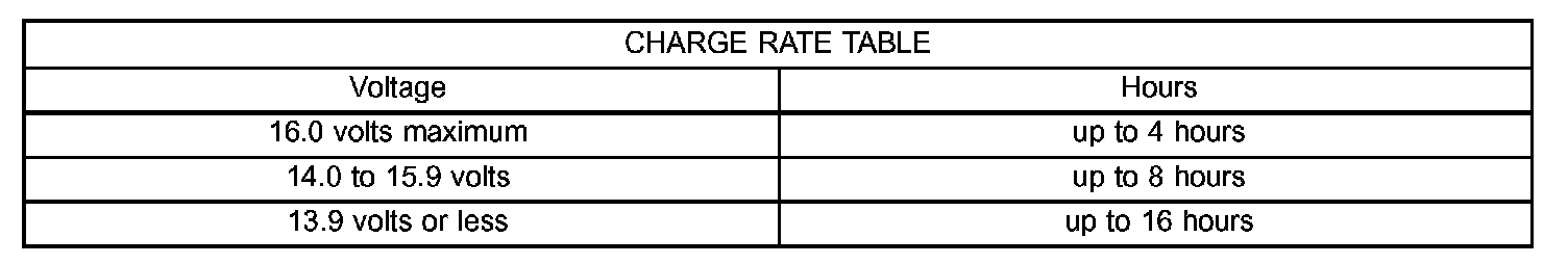 3. Battery chargers vary in the amount of voltage and current they provide. The amount of time required for a battery to accept measurable charging current at various voltages is shown in the Charge Rate Table. If the charging current is still not measurable at the end of the charging time, the battery is inoperative and must be replaced. If the charging current is measurable during the charging time, the battery may be good and the charging should be completed in the normal manner.