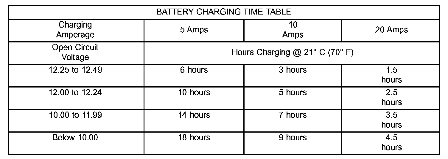 The Battery Charging Time Table gives an indication of the time required to charge a typical battery at room temperature based upon the battery state-of-charge and the charger capacity.
