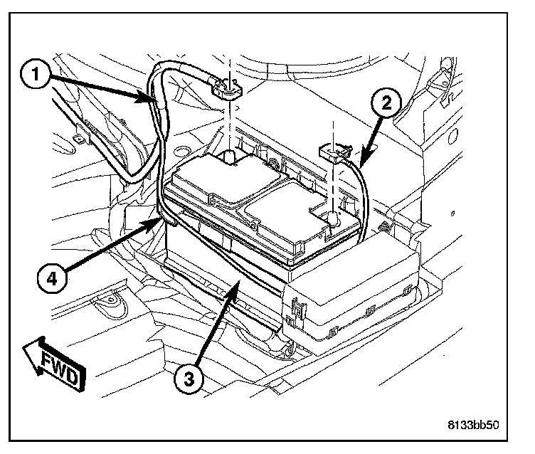1. Connect the battery negative cable (2) to the battery post and tighten the clamp nut.