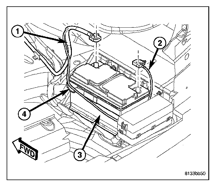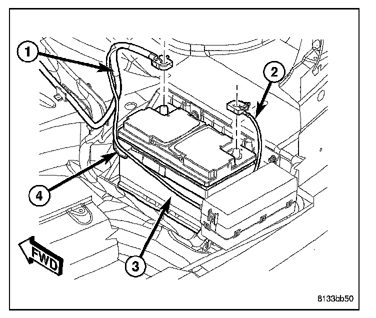 3. Disconnect the battery negative cable (2) from the battery terminal.