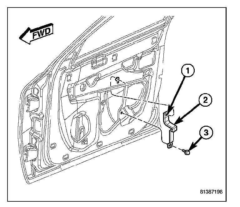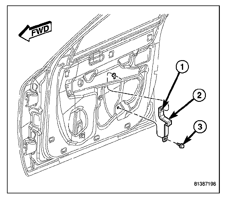 11. Install and tighten the screw (3) that secures the bottom of the pull cup bracket and the bottom of the window regulator rear rail to the inside of the front door. Tighten the screw to 11 N.m (100 in.lbs.).
