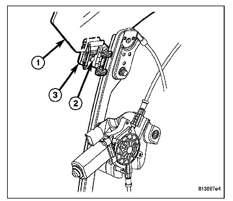 7. Using the regulator, adjust the front door glass (1) position up or down as required for access to the two window regulator glass clamps (3).