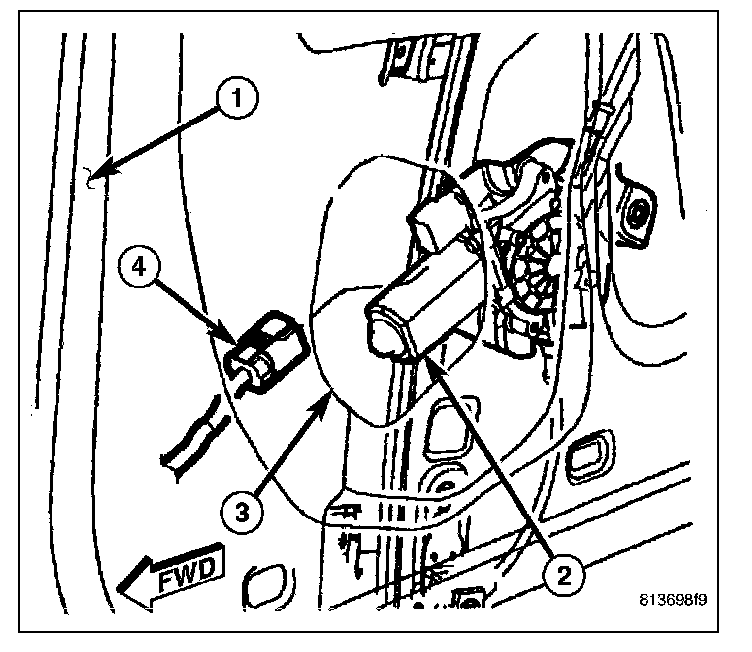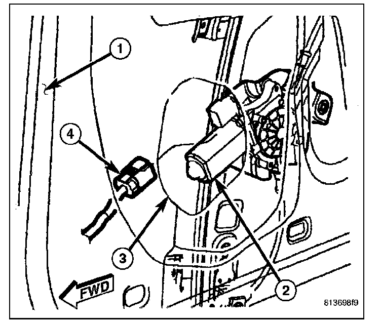 13. Lower the front regulator rail within the door (1) far enough to access and disconnect the door wire harness connector (4) from the regulator motor (2) through the speaker mounting hole (3) on the inside of the door near the front.
