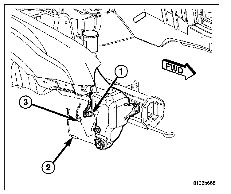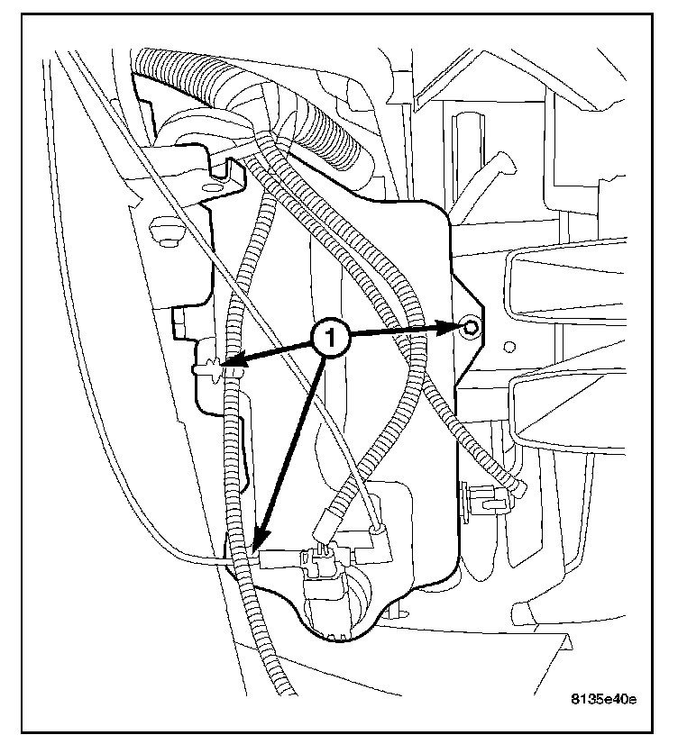 2. Drain washer fluid from the reservoir and into a suitable clean container. This can be done by disconnecting the windshield washer hose from the front (outboard) washer pump and allowing the washer fluid to drain into a container through a temporary jumper hose connected to the front washer pump.