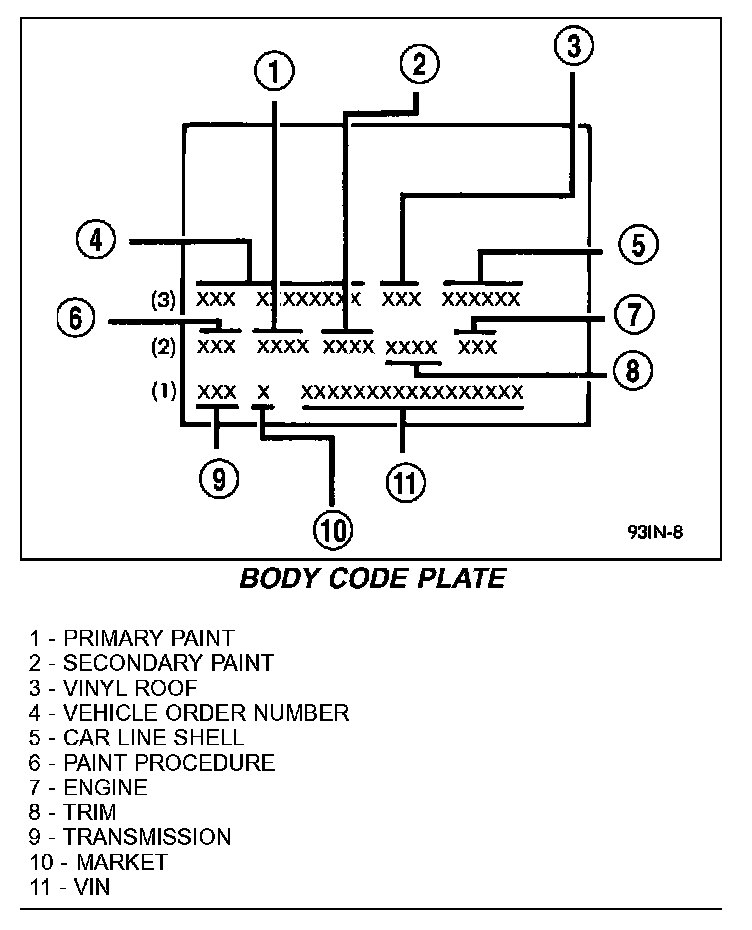 There are seven lines of information on the body code plate. Lines 4, 5, 6, and 7 are not used to define service information. Information reads from left to right, starting with line 3 in the center of the plate to line 1 at the bottom of the plate.