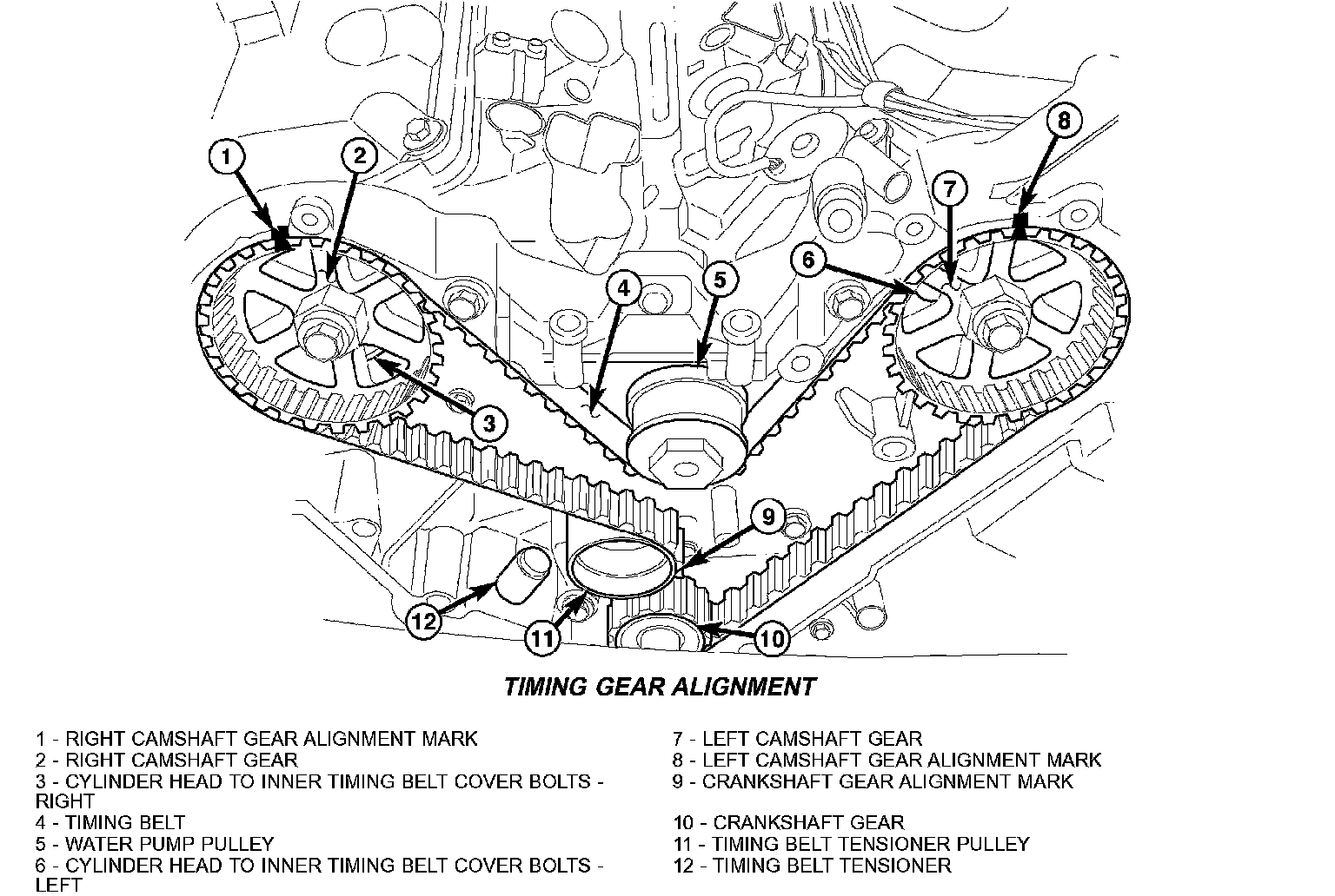 Remove the outer timing covers. Rotate the crankshaft until the pointer on the crankshaft sprocket (10) aligns the TDC mark on the oil pump (9). Check to determine if the camshaft sprocket (2, 7) timing marks (1, 8) are aligned with the marks on the inner timing cover. It may take an additional full revolution of the crankshaft before the camshaft sprocket marks are aligned.