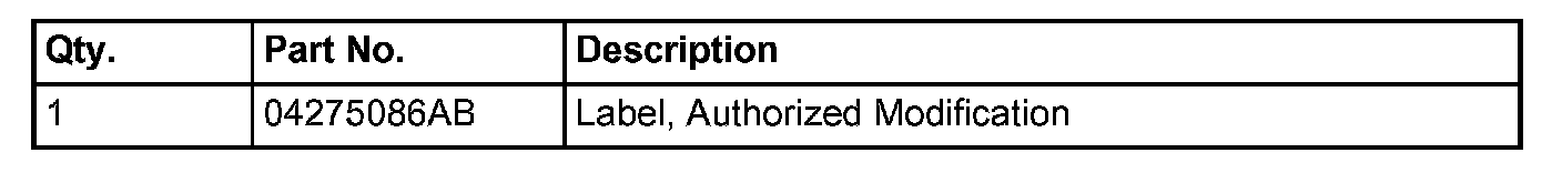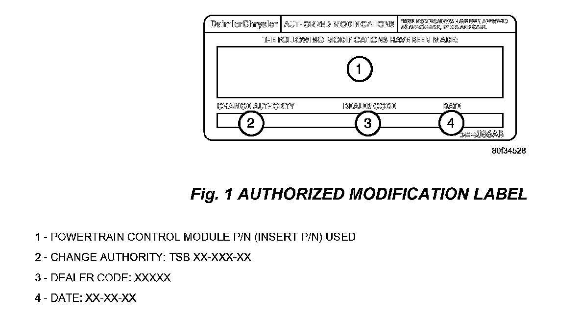 6. Type the necessary information on the "Authorized Modification Label" p/n 04275086AB and attach near the VECI label (Fig. 1).