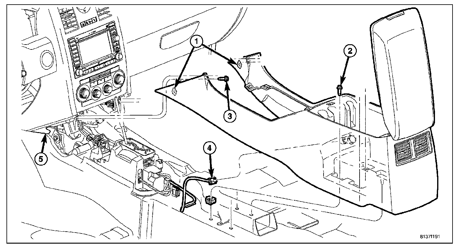 2. While holding both sides of the console at the front carefully engage the ears at the front of the console to the slots (5) at the lower instrument panel.
