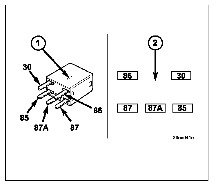 The A/C clutch relay (1) is a International Standards Organization (ISO) micro-relay. Relays conforming to the ISO specifications have common physical dimensions, current capacities, terminal functions and patterns (2). The ISO micro-relay terminal functions are the same as a conventional ISO relay. However, the ISO micro-relay terminal pattern (or footprint) is different, the current capacity is lower, and the physical dimensions are smaller than those of the conventional ISO relay.